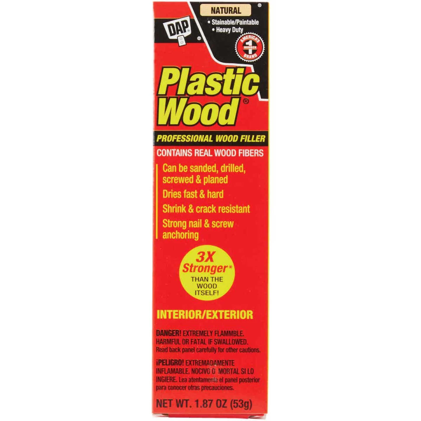 A high-performance, solvent-based wood filler that hardens to give a repair that is 3X stronger than the wood itself, when compared to white pine. This professional-grade, heavy duty wood filler contains real wood fibers so it looks and acts like real wood. It can be sanded, cut, drilled, screwed, planed, stained, varnished, painted, or lacquered. It provides strong nail and screw anchoring without splitting. DAP Plastic Wood Professional Wood Filler dries fast and hard, and is shrink and crack resistant. For use on furniture, doors, paneling, molding, plywood, and other wood surfaces. Available in several popular wood shades, this high-performance wood filler can also be stained to match any wood shade. For interior/exterior use.