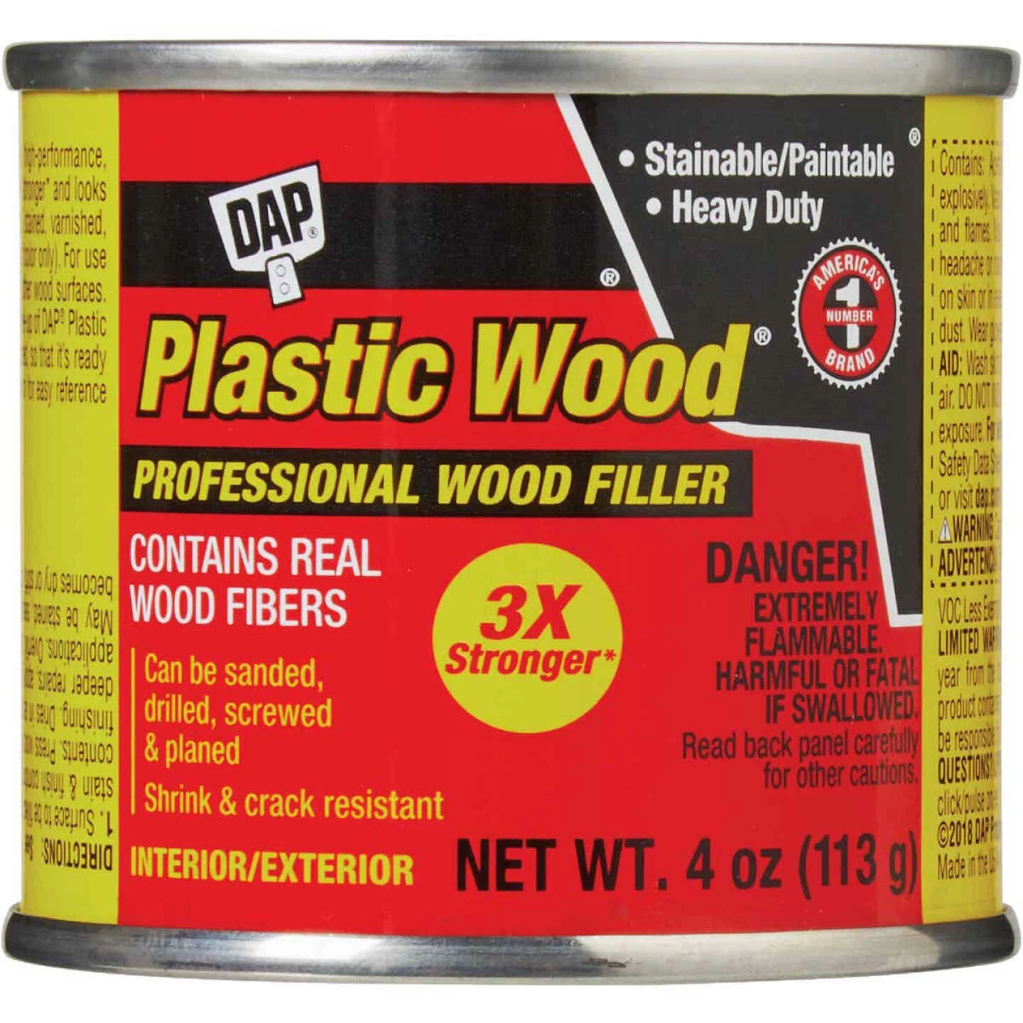 A high-performance, solvent-based wood filler that hardens to give a repair that is 3X stronger than the wood itself, when compared to white pine. This professional-grade, heavy duty wood filler contains real wood fibers so it looks and acts like real wood. It can be sanded, cut, drilled, screwed, planed, stained, varnished, painted, or lacquered. It provides strong nail and screw anchoring without splitting. DAP Plastic Wood Professional Wood Filler dries fast and hard, and is shrink and crack resistant. For use on furniture, doors, paneling, molding, plywood, and other wood surfaces. Available in several popular wood shades, this high-performance wood filler can also be stained to match any wood shade. For interior/exterior use.